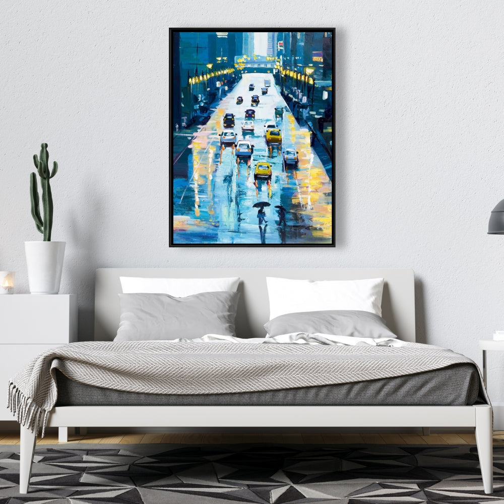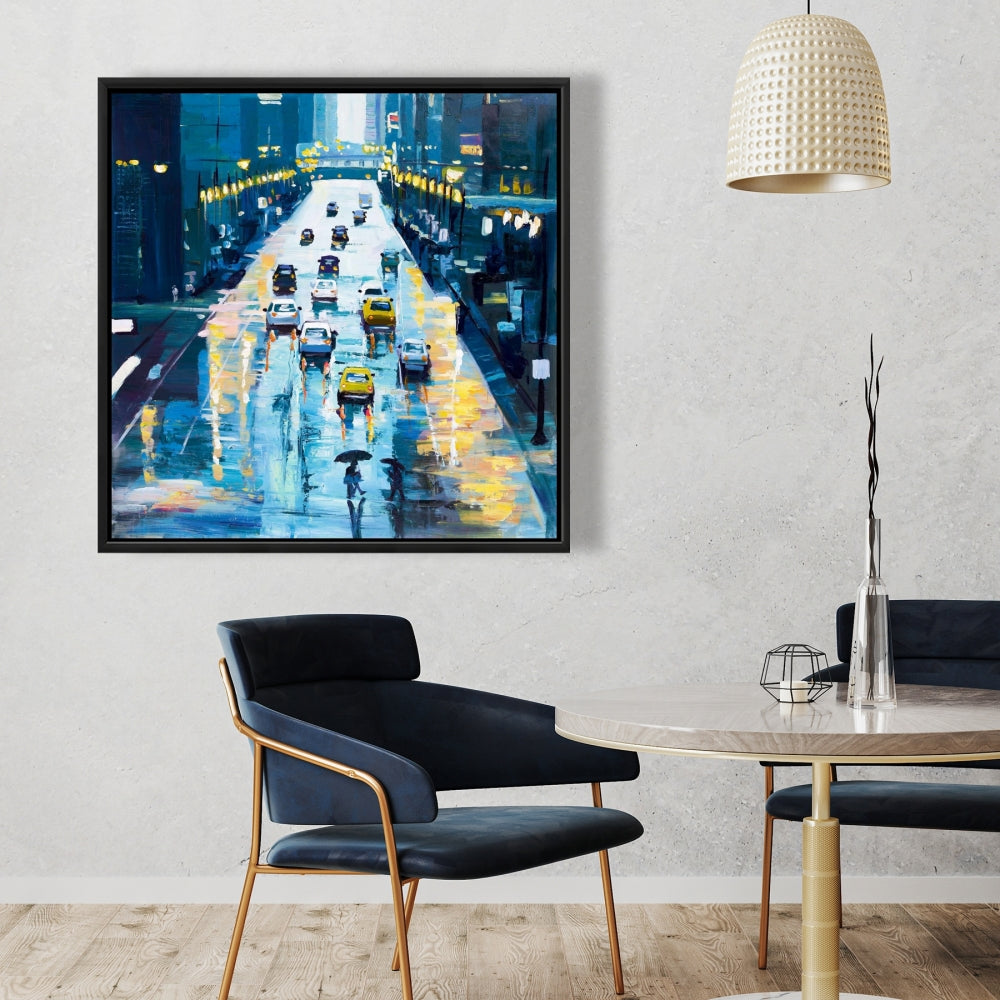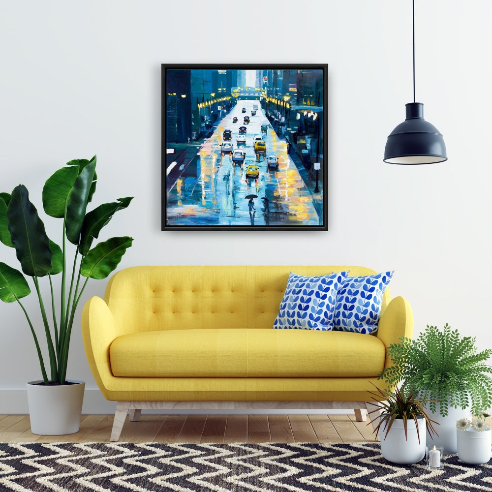 Toile « Rues pluvieuses de New York » | Décoration d'intérieur encadrée bleue