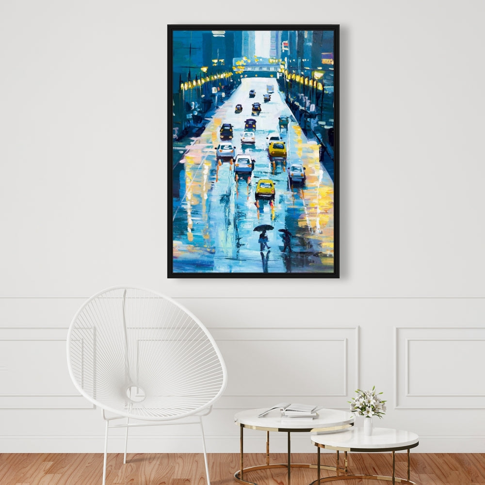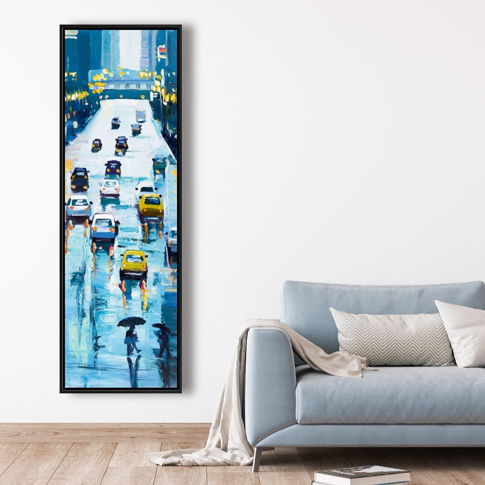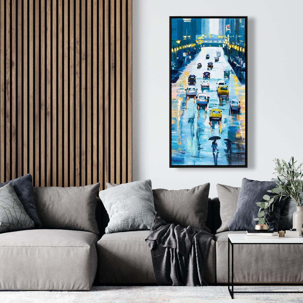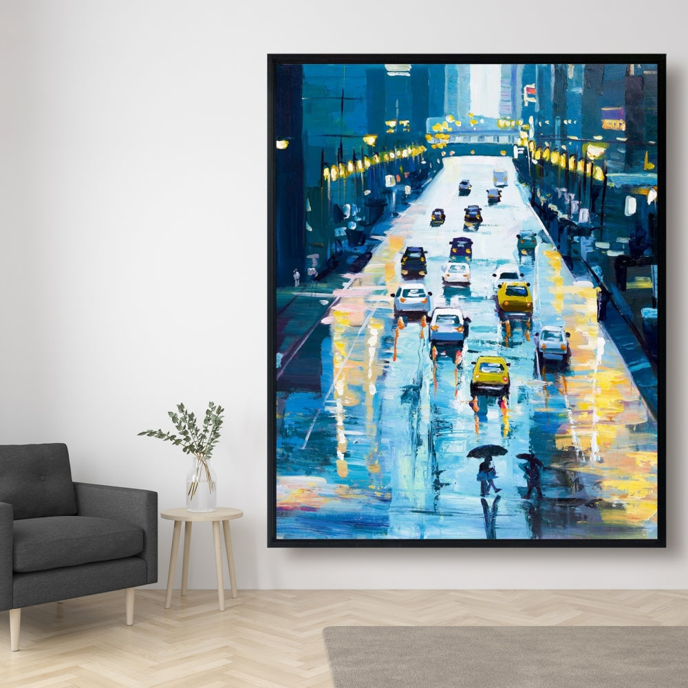 Toile « Rues pluvieuses de New York » | Décoration d'intérieur encadrée bleue