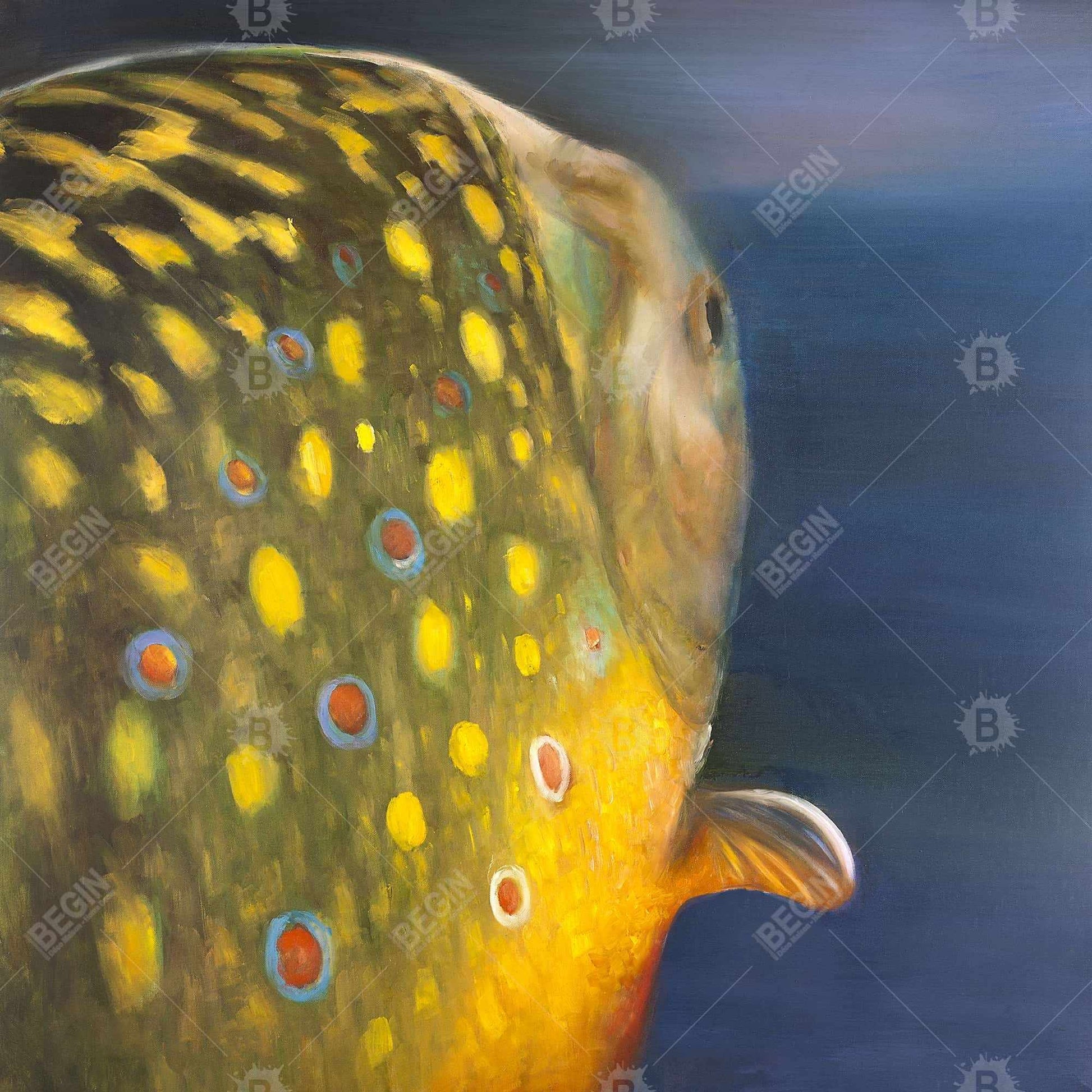 Toile rustique représentant une truite dorée | Décoration murale bleue pour chambre