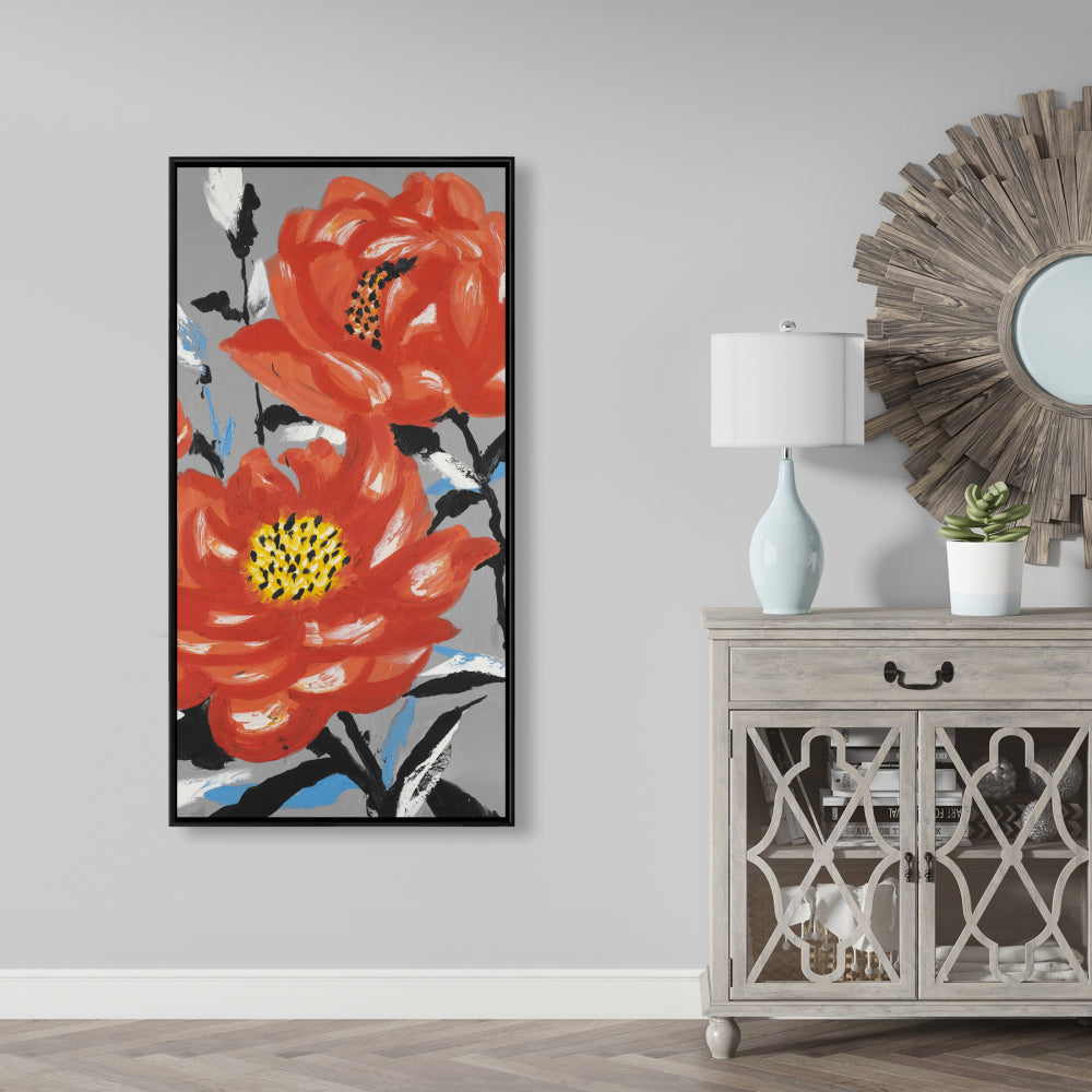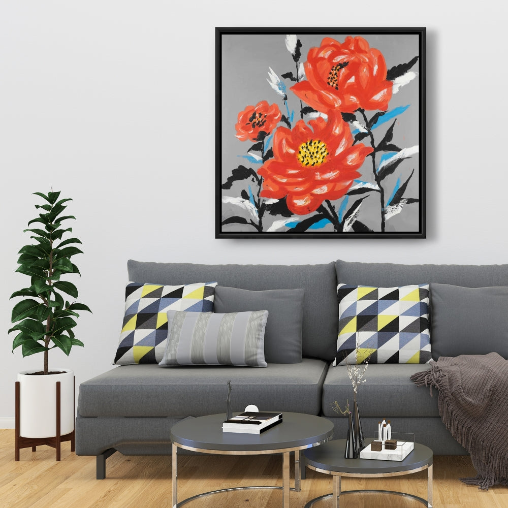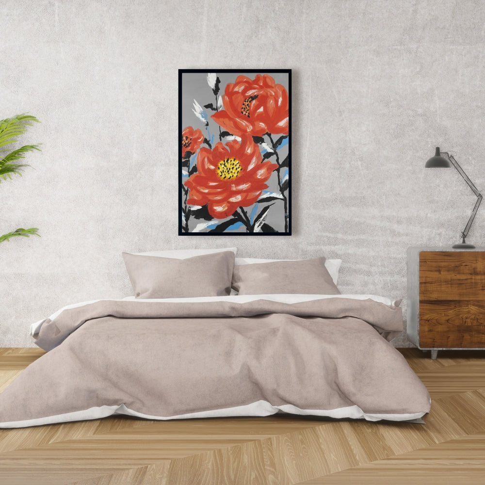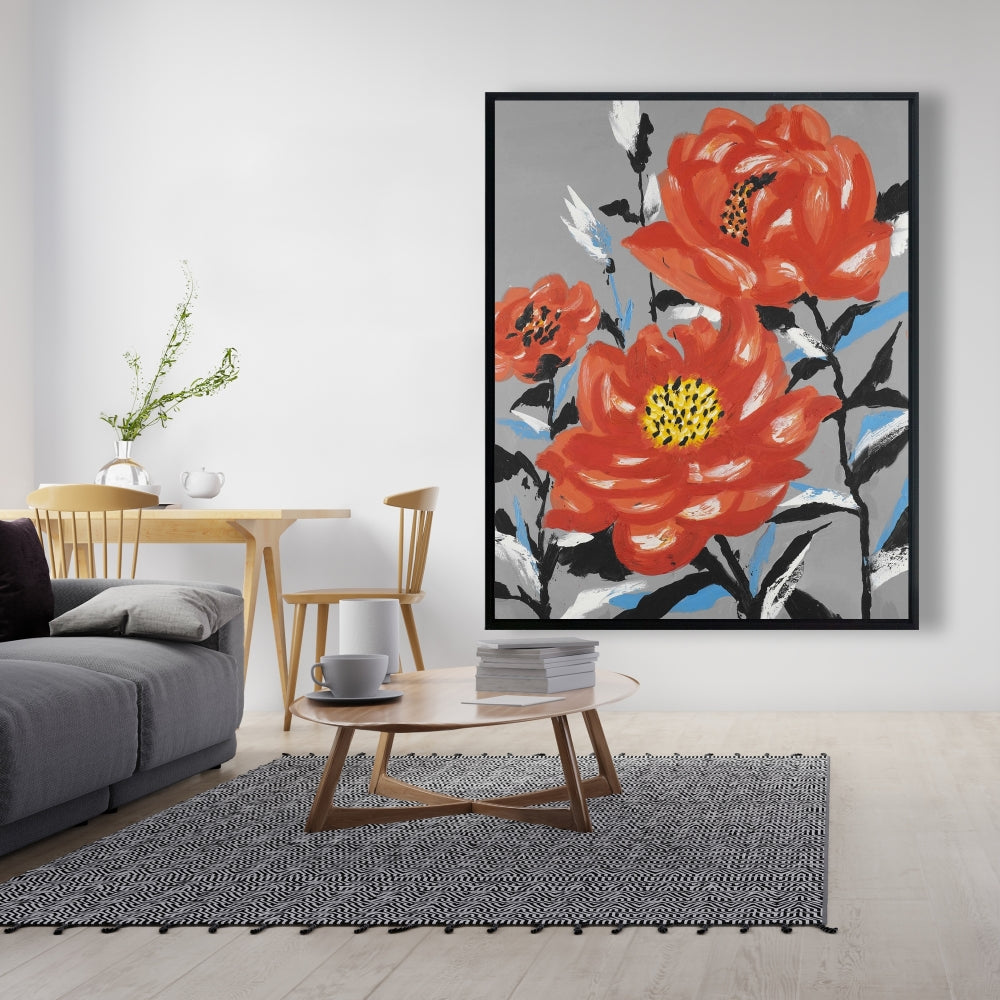 Toile florale grise | Trois fleurs roses, décoration murale encadrée