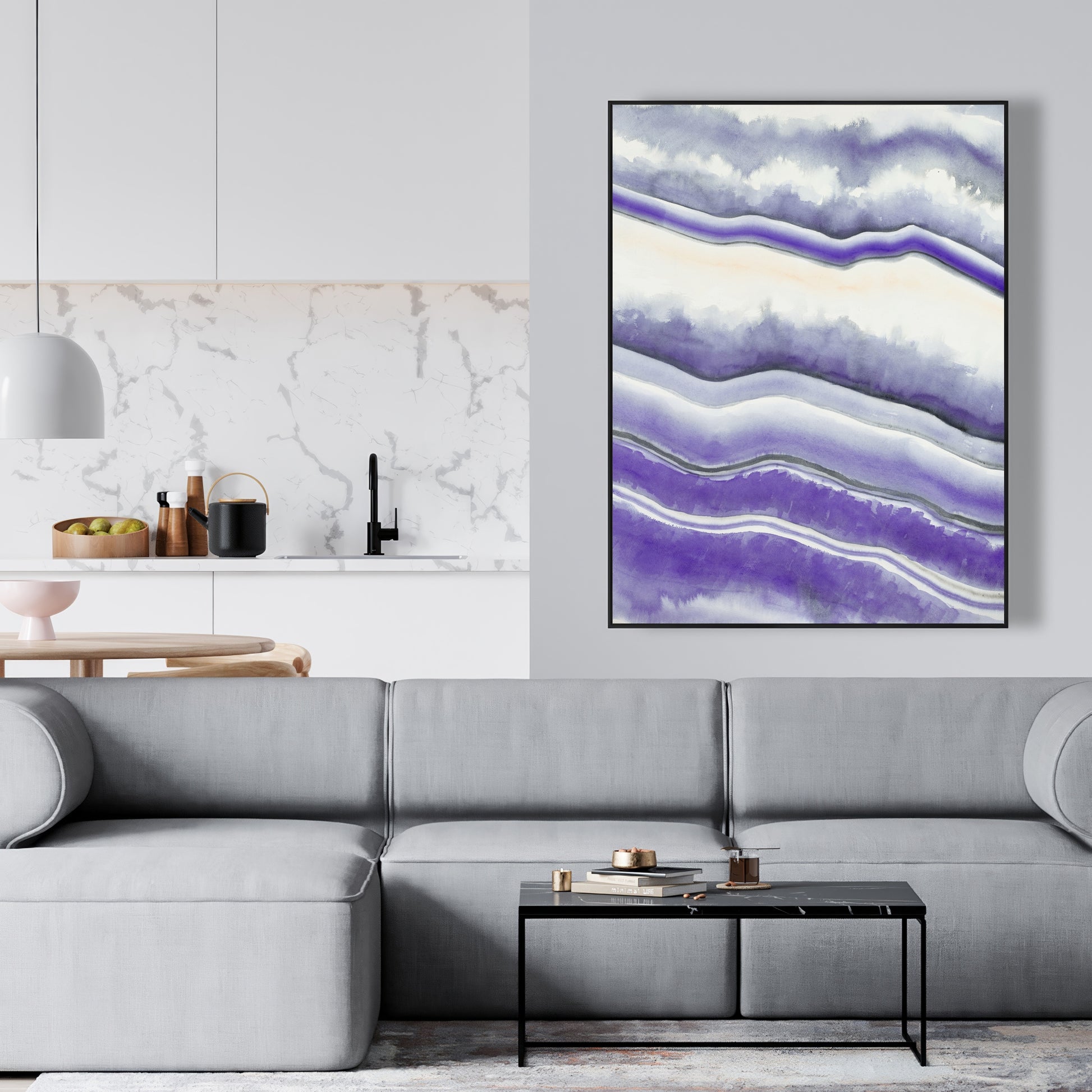 Transformez votre espace de vie grâce au charme captivant de la toile encadrée abstraite violette « Géode violette ». Cette superbe pièce de décoration est parfaite pour ceux qui apprécient l'élégance des teintes violettes et la beauté complexe des formations de géodes. Idéale pour les intérieurs modernes, cette œuvre d'art apporte une touche de sophistication et de dynamisme à n'importe quelle pièce.