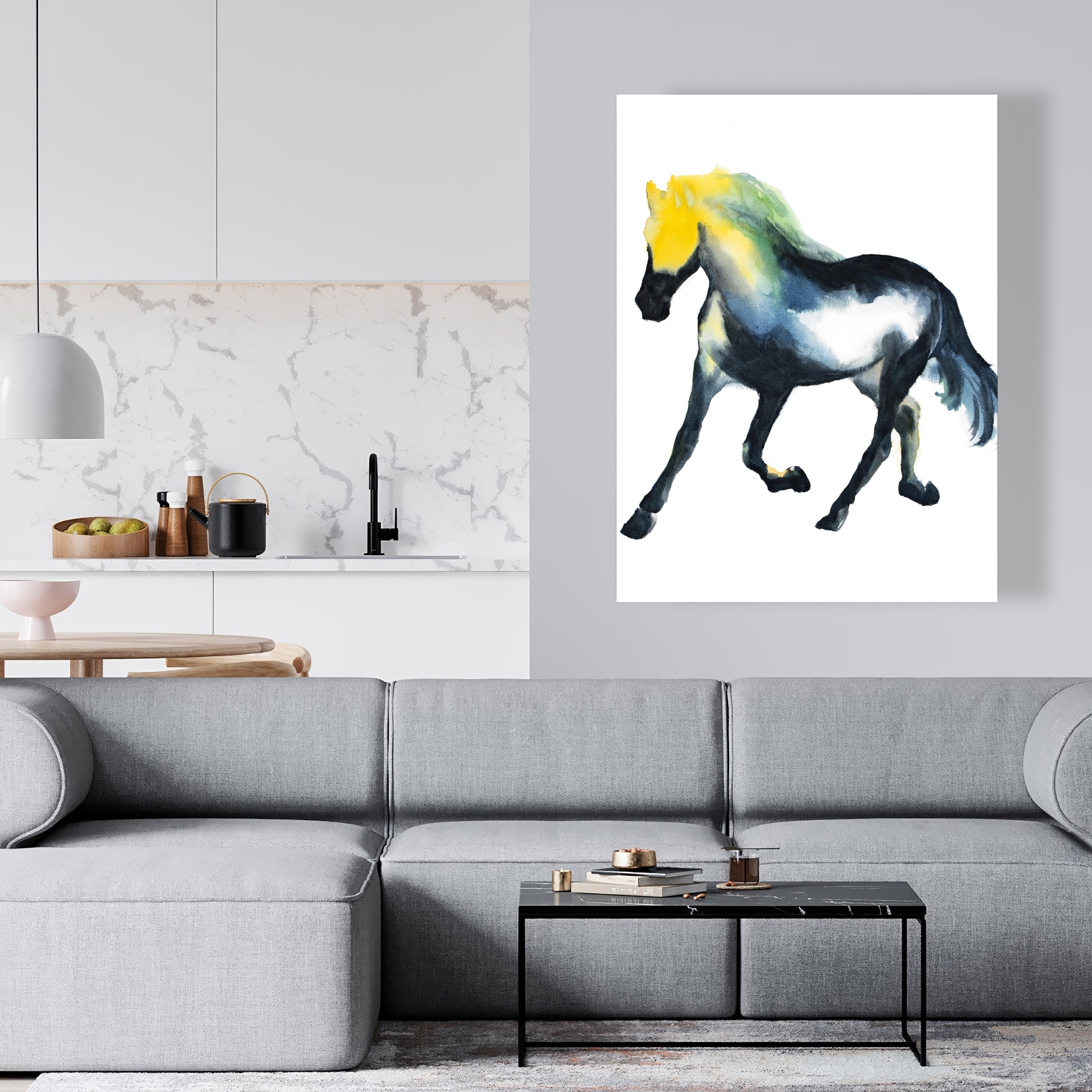 Cheval au galop, animaux de la ferme, toile bleue | Décoration d'intérieur