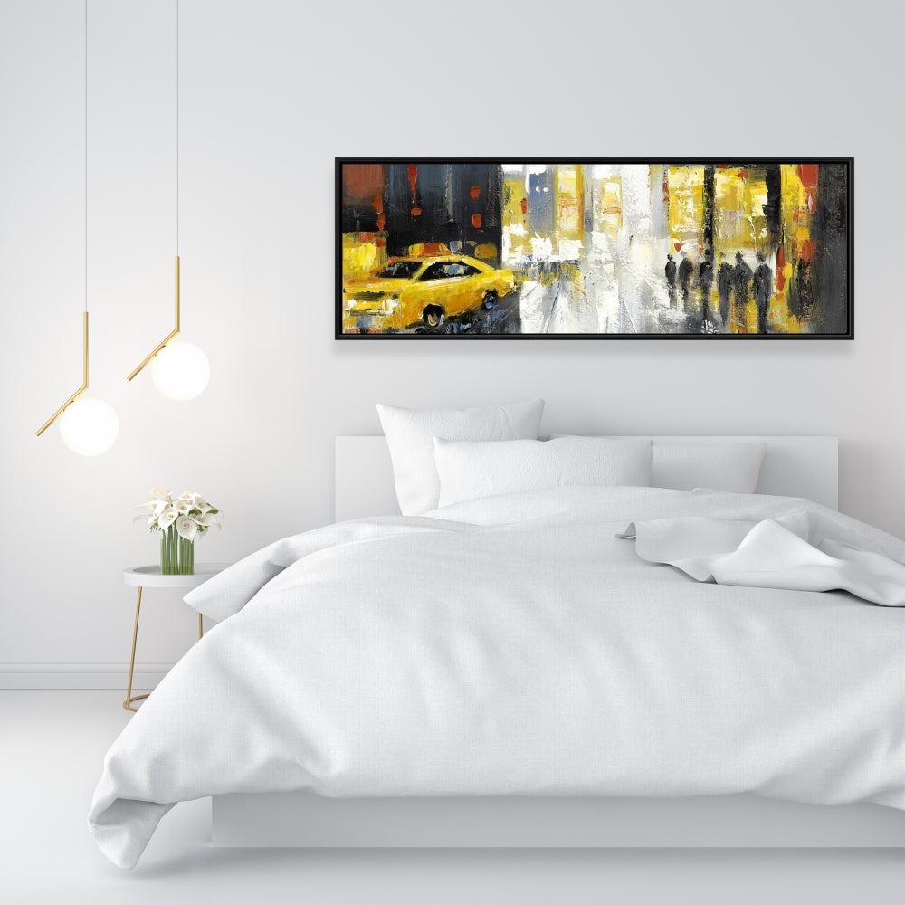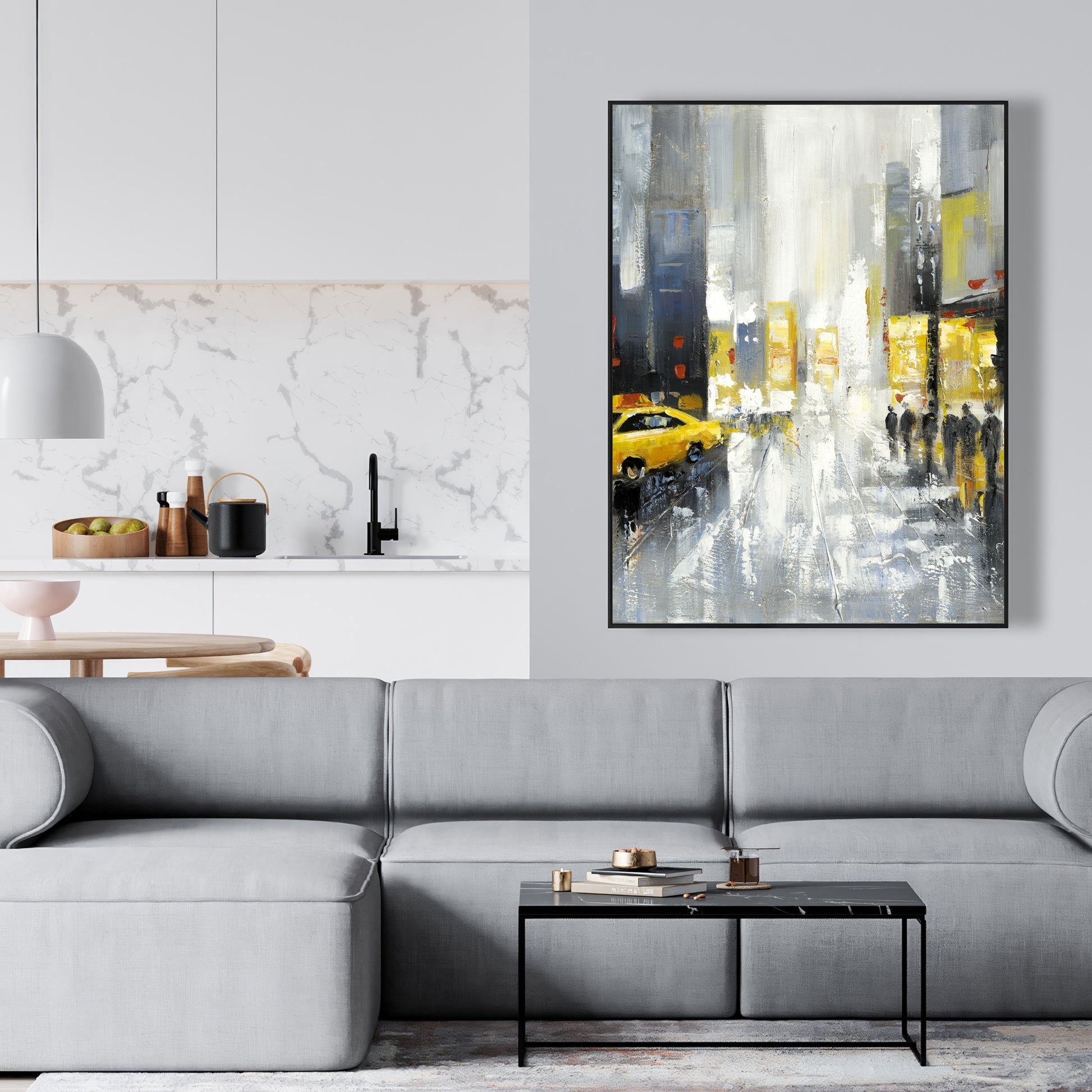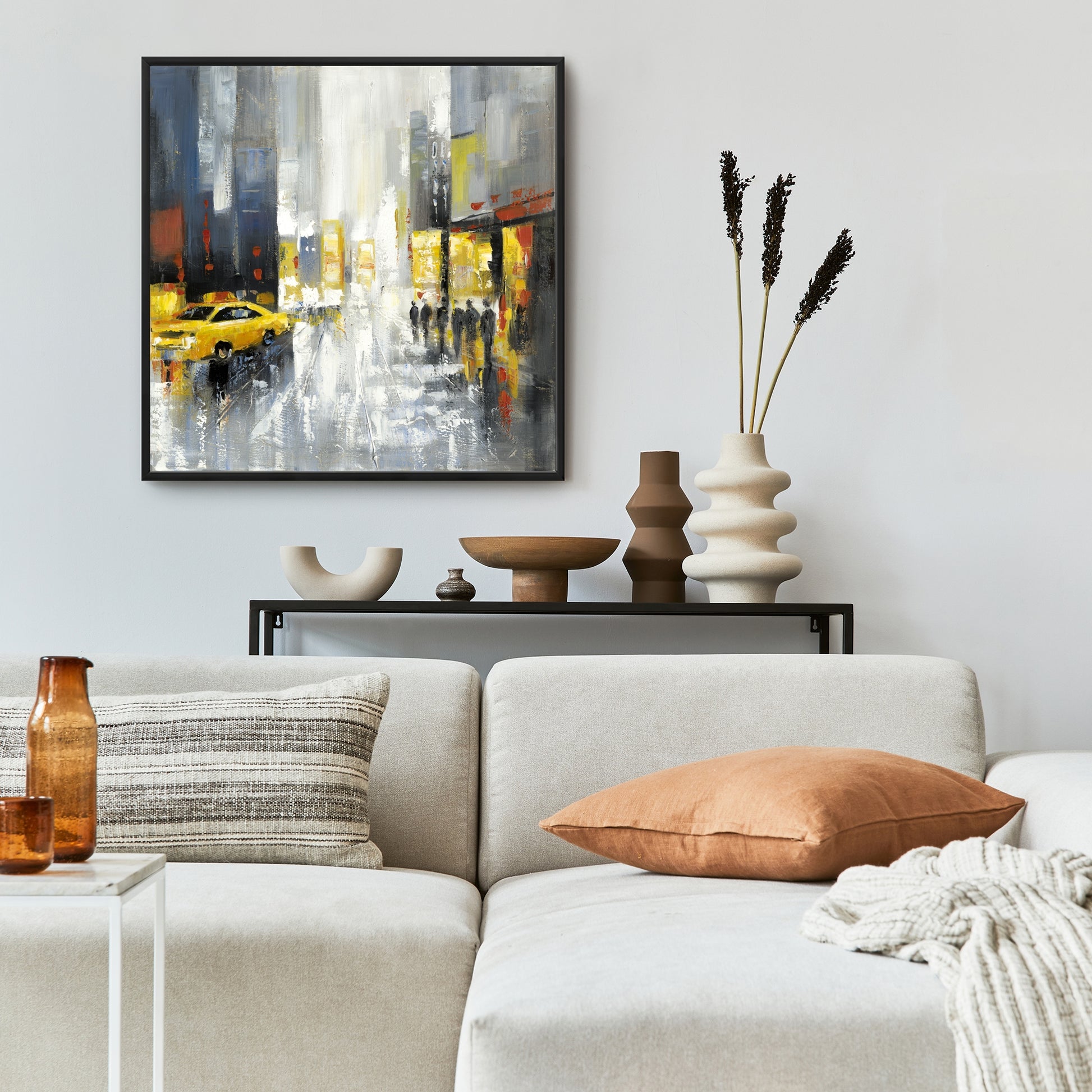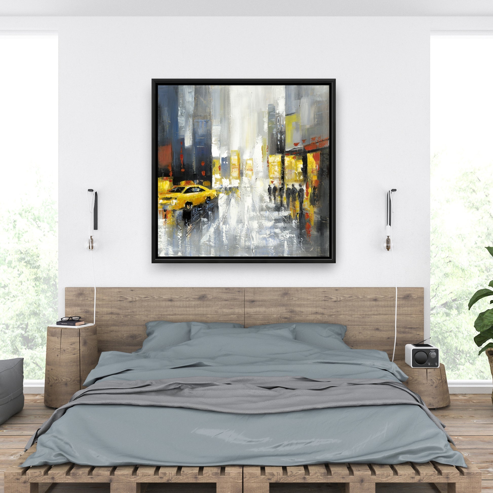 Toile encadrée grise contemporaine - Décoration de rue pluvieuse et animée