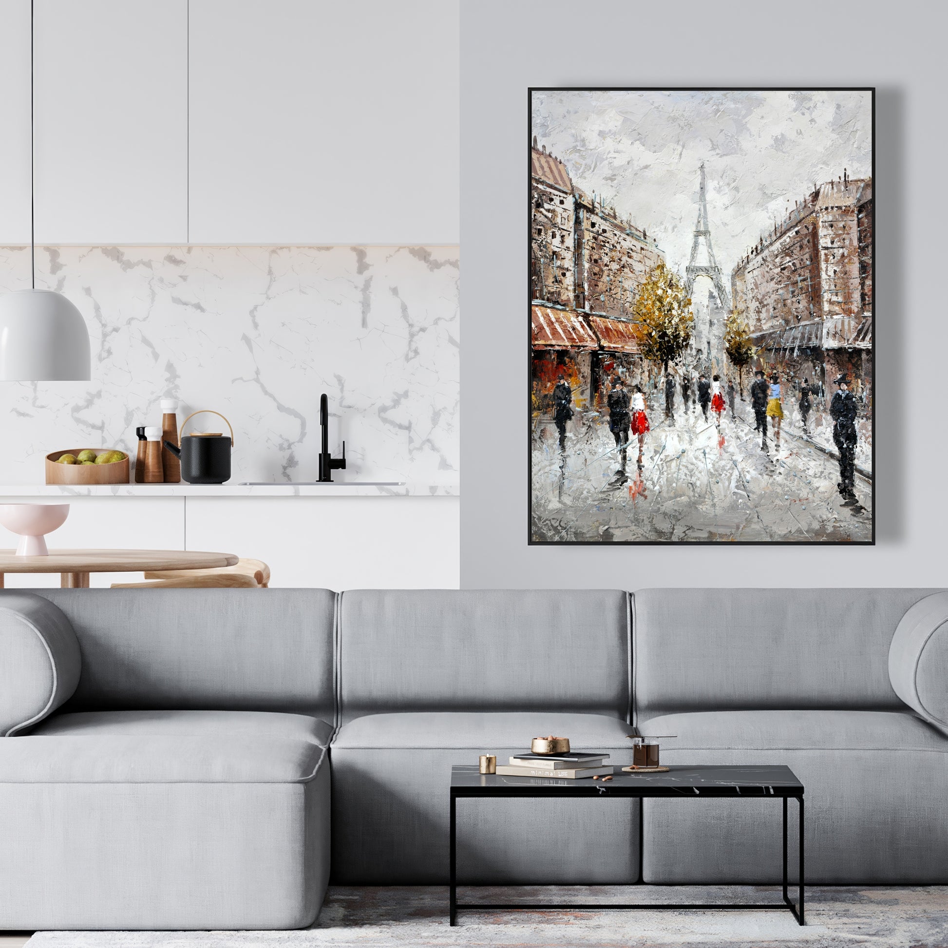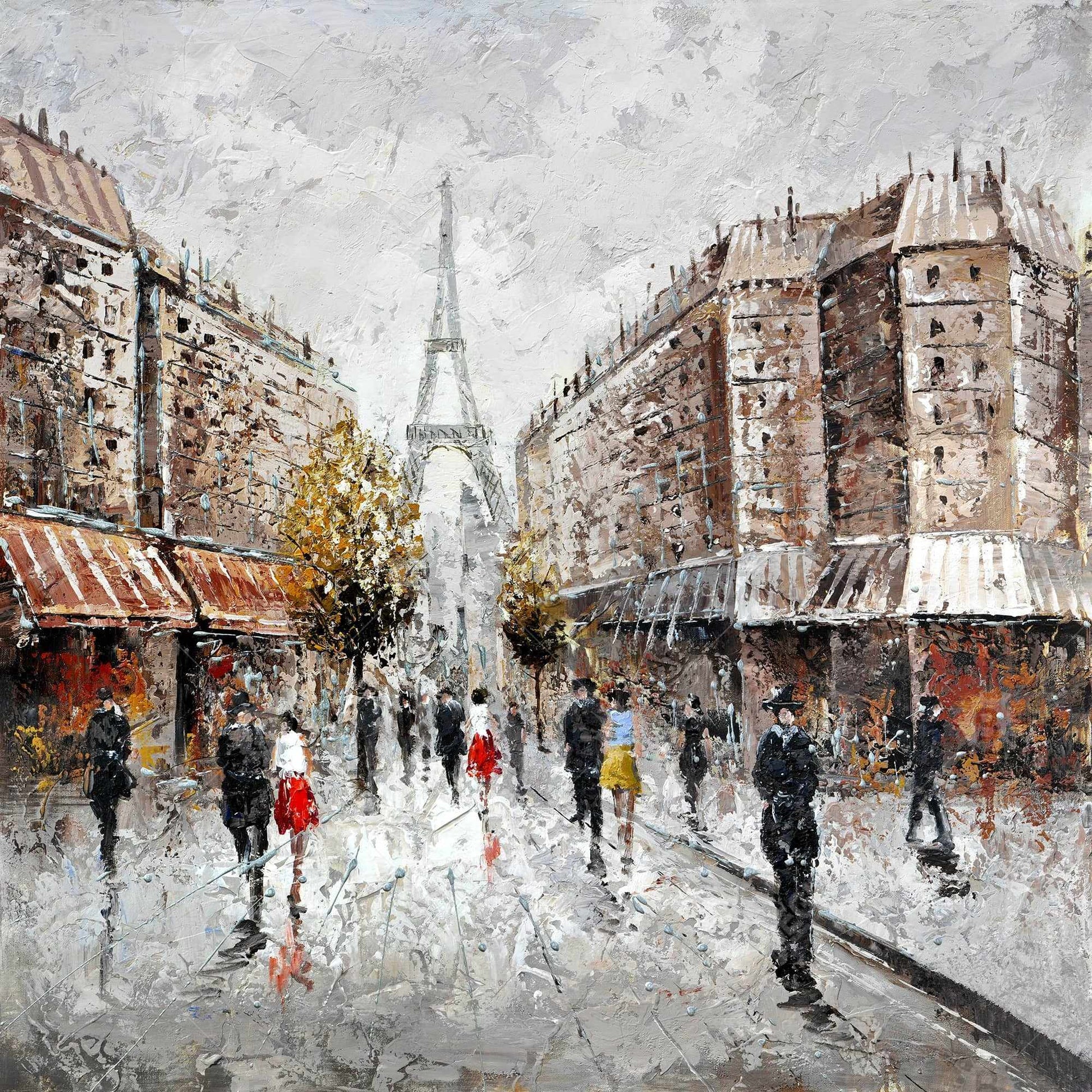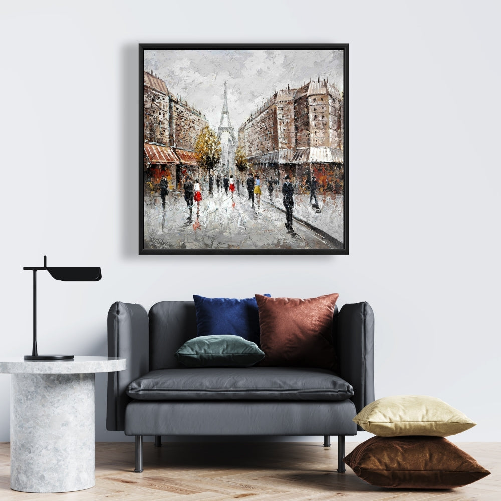 Toile encadrée représentant une rue animée de Paris – Bâtiment brun