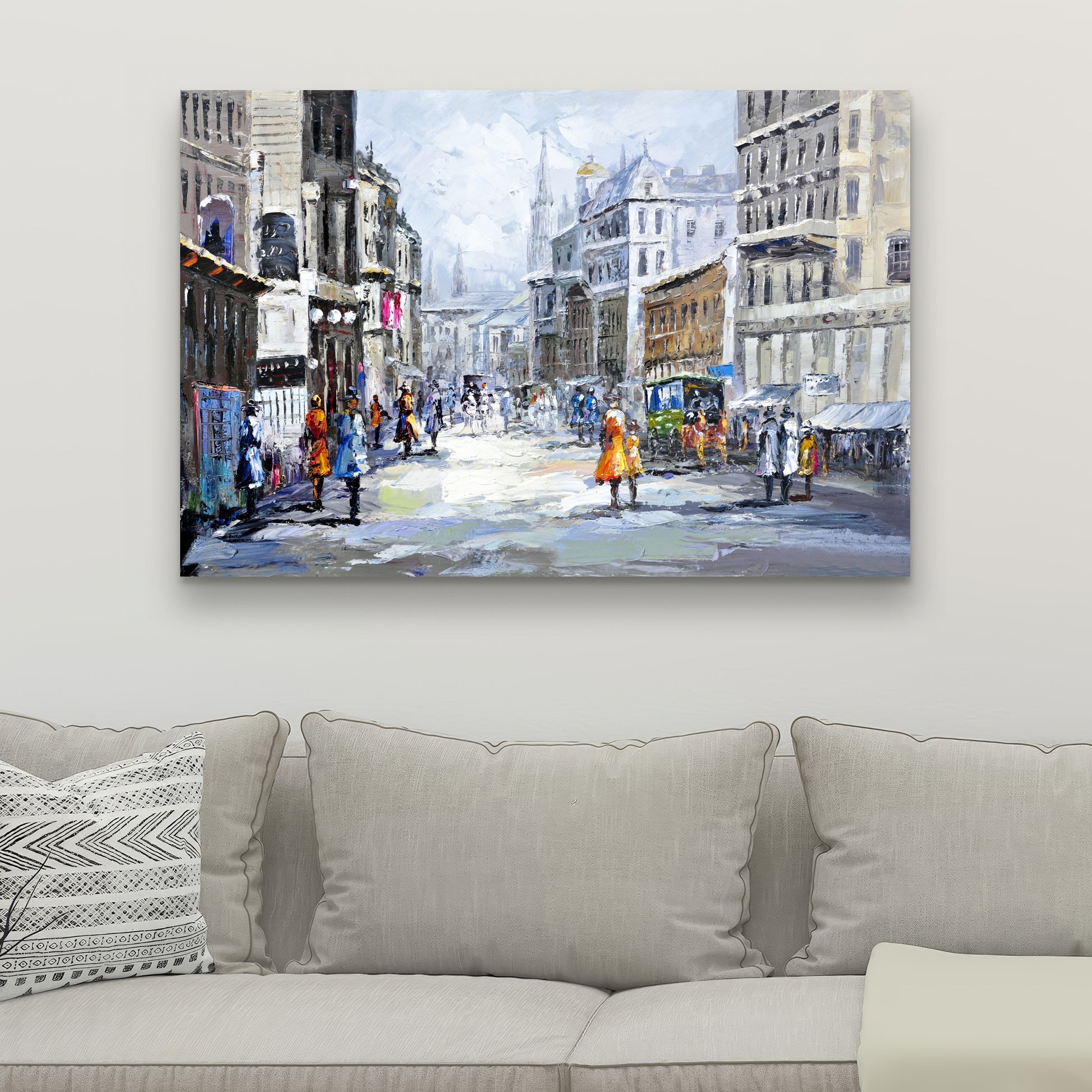 Busy Street Blue Building Canvas | Cloudy Day Home Decor