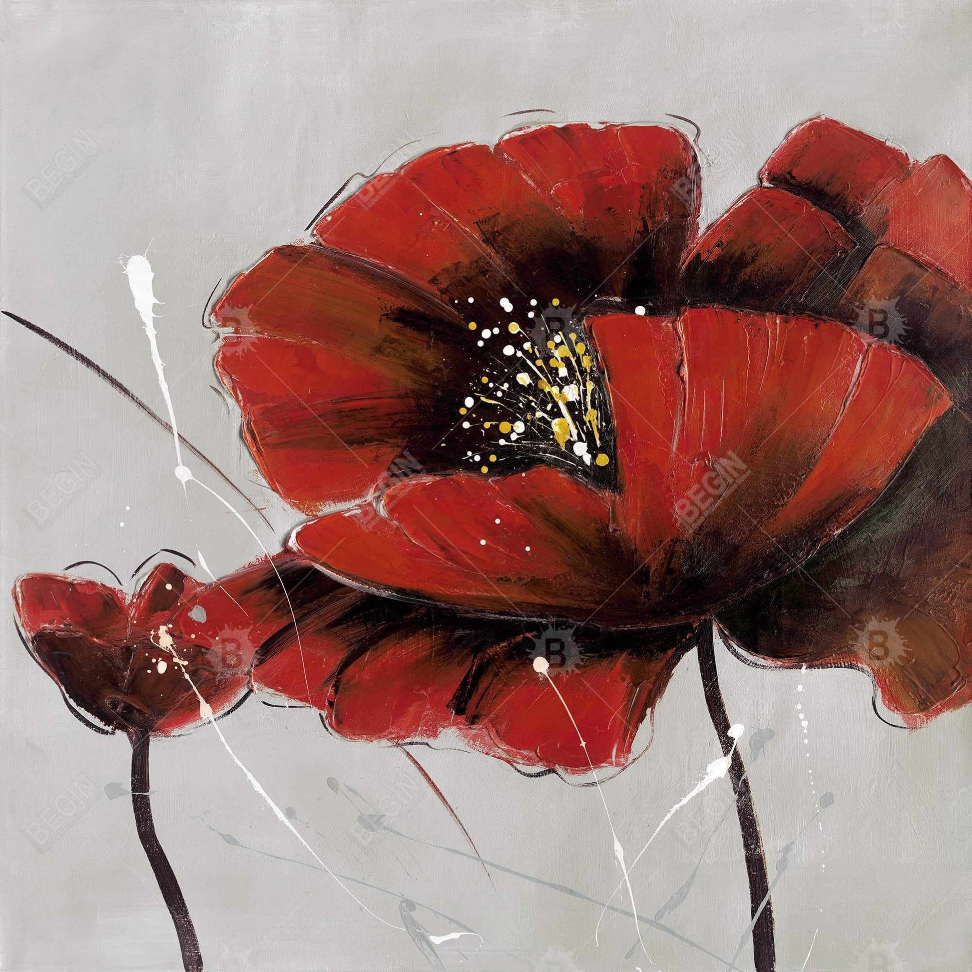 Toile botanique florale grise – Décoration d'intérieur à fleurs de pavot rouge