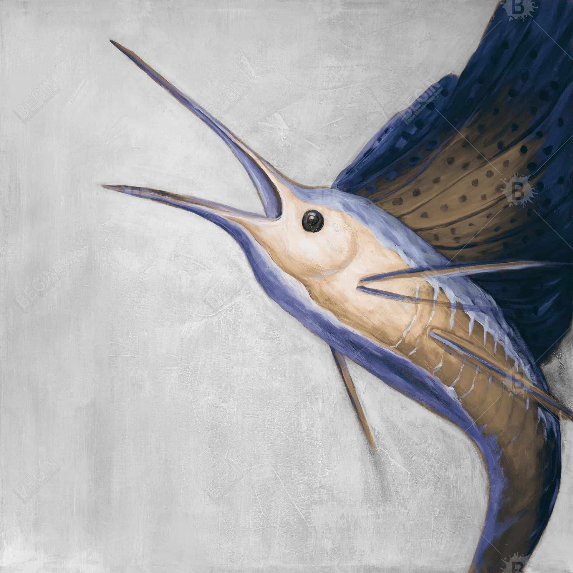 Toile marine représentant un espadon doré | Décoration murale encadrée bleue