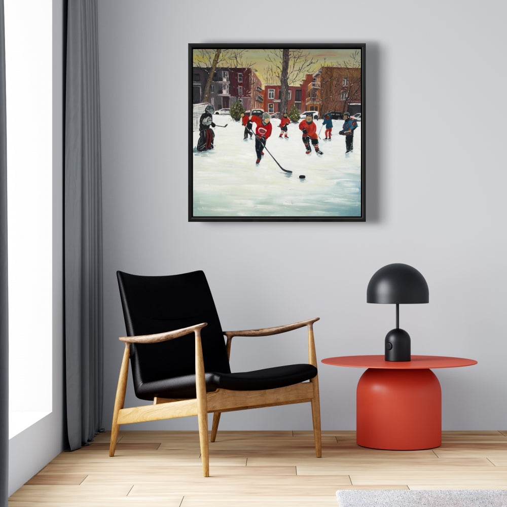 Toile encadrée marron représentant de jeunes joueurs de hockey