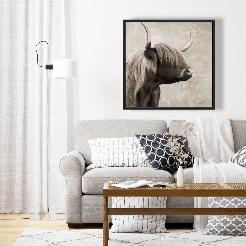 Magnifique toile sépia représentant un bétail des Highlands | Décoration de salle de bain rustique