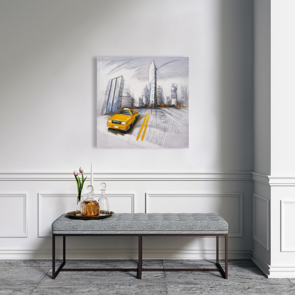 Enhance your home decor with the captivating Illustrative Bedroom Blue Canvas featuring "Yellow Taxi and City Sketch." This eye-catching artwork effortlessly blends vibrant colors and urban charm, making it an ideal centerpiece for any bedroom setting. The vivid yellow taxi contrasts beautifully against the cityscape sketch, creating a dynamic focal point that brings energy and style to your space.