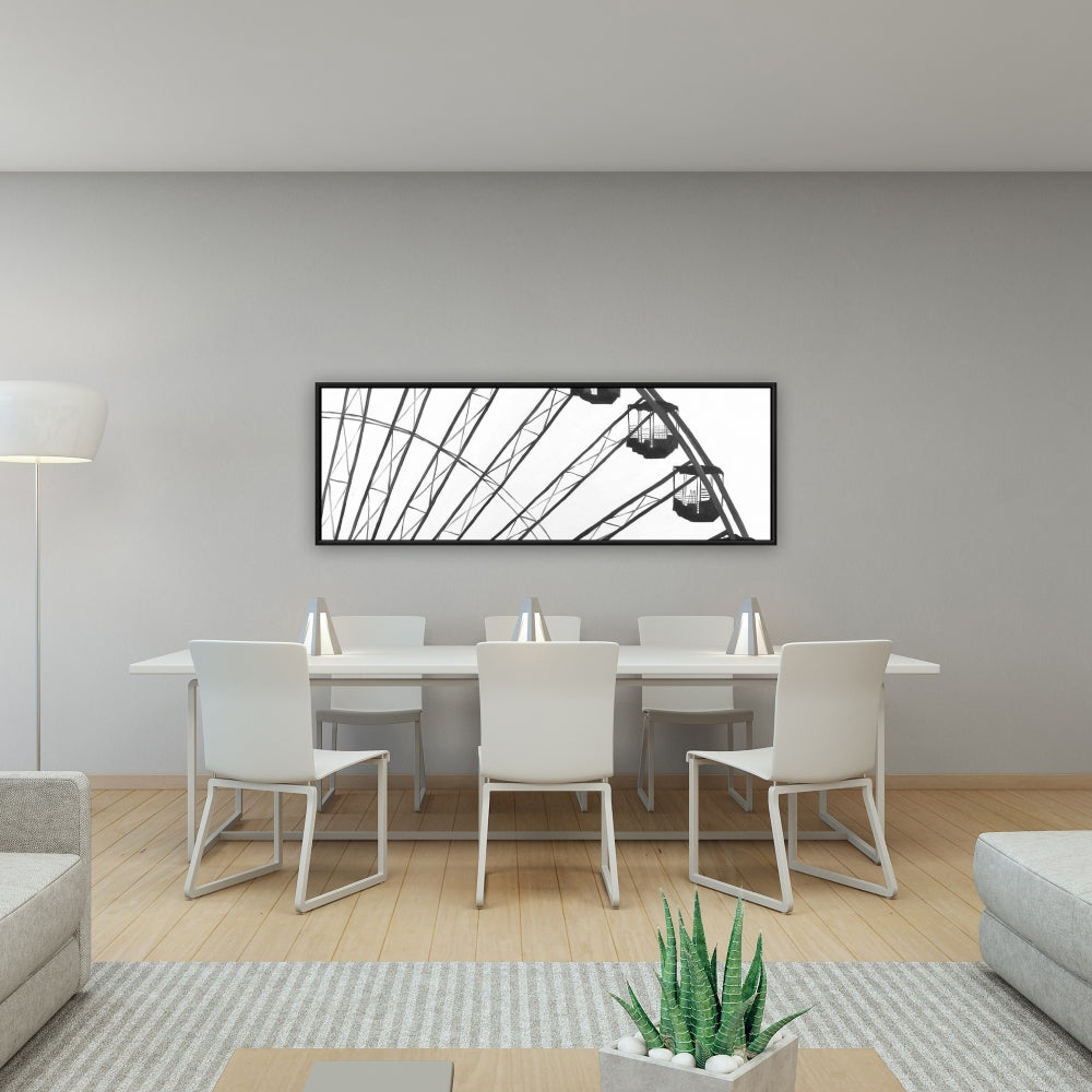 The crisp white frame complements the artwork's clean lines and neutral tones, ensuring it seamlessly blends with various decor styles, from contemporary to classic. Ideal for creating a focal point in your room, this canvas is designed to inspire and captivate, inviting viewers to explore the beauty of architectural design and the joy of a ferris wheel ride.