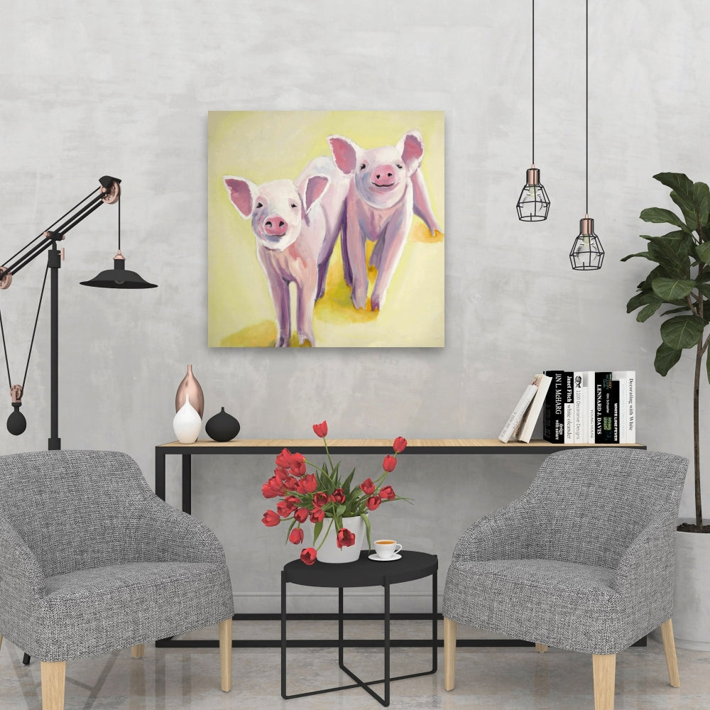 Yellow Illustrative Canvas - Two Smiling Pigs for Bedroom Decor