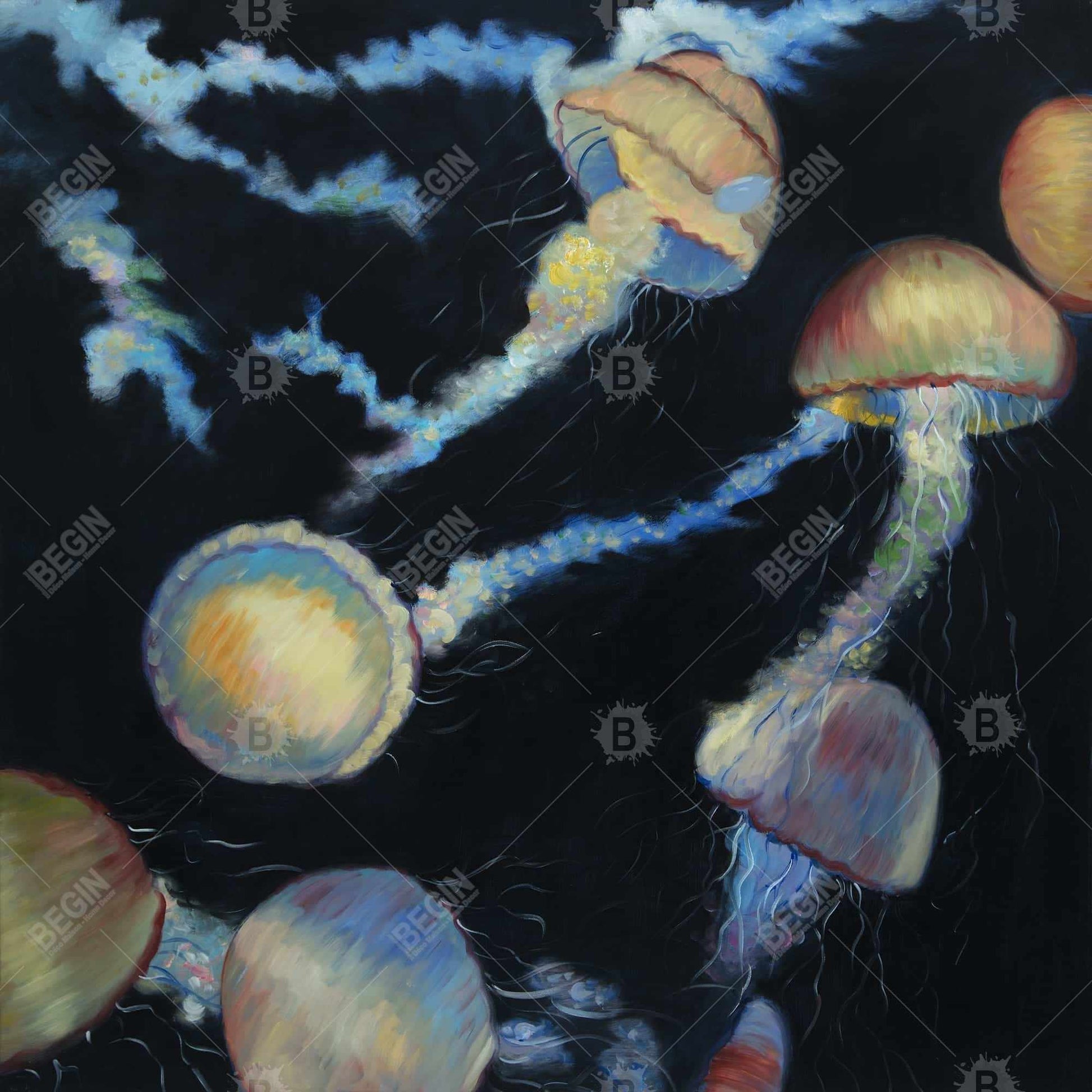 Colorful Jellyfishes in the Dark Blue Canvas - Home Decor