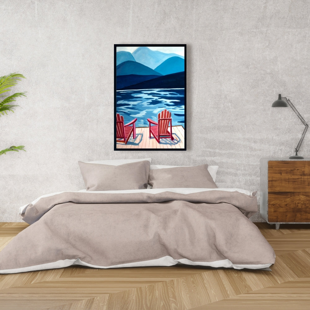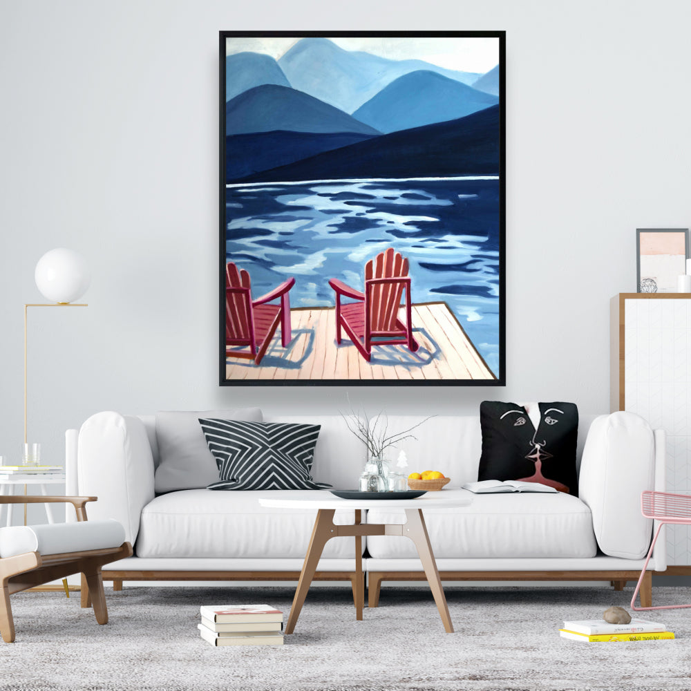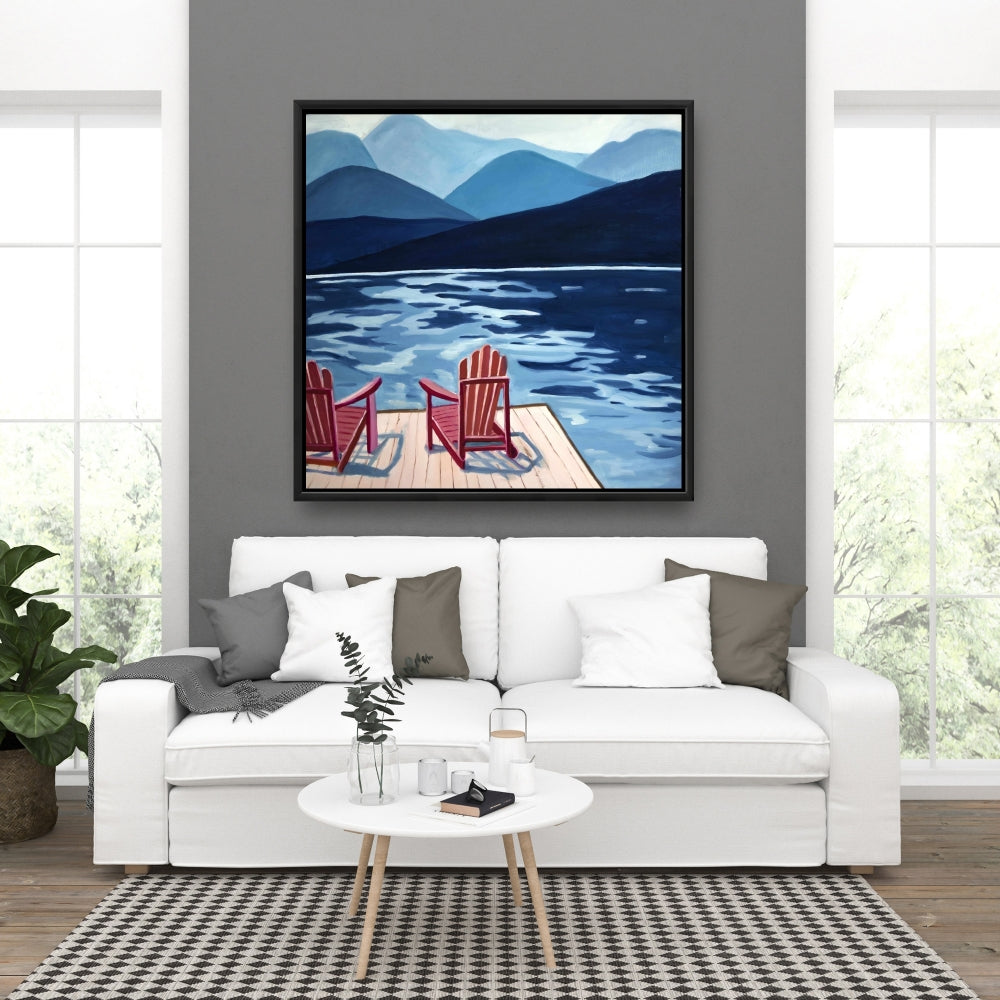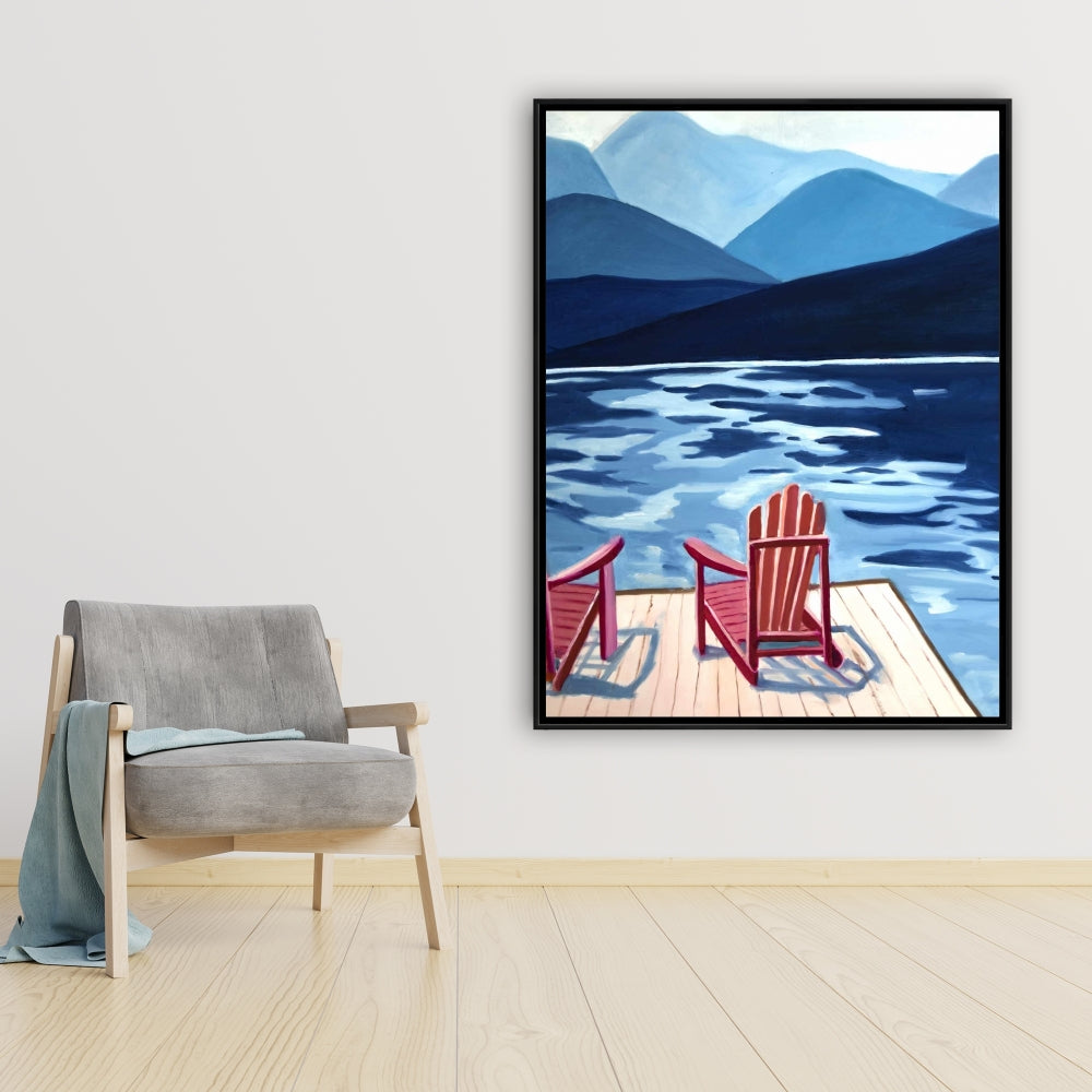 Mountains Marine Blue Canvas - Lake, Dock, Mountains & Chairs