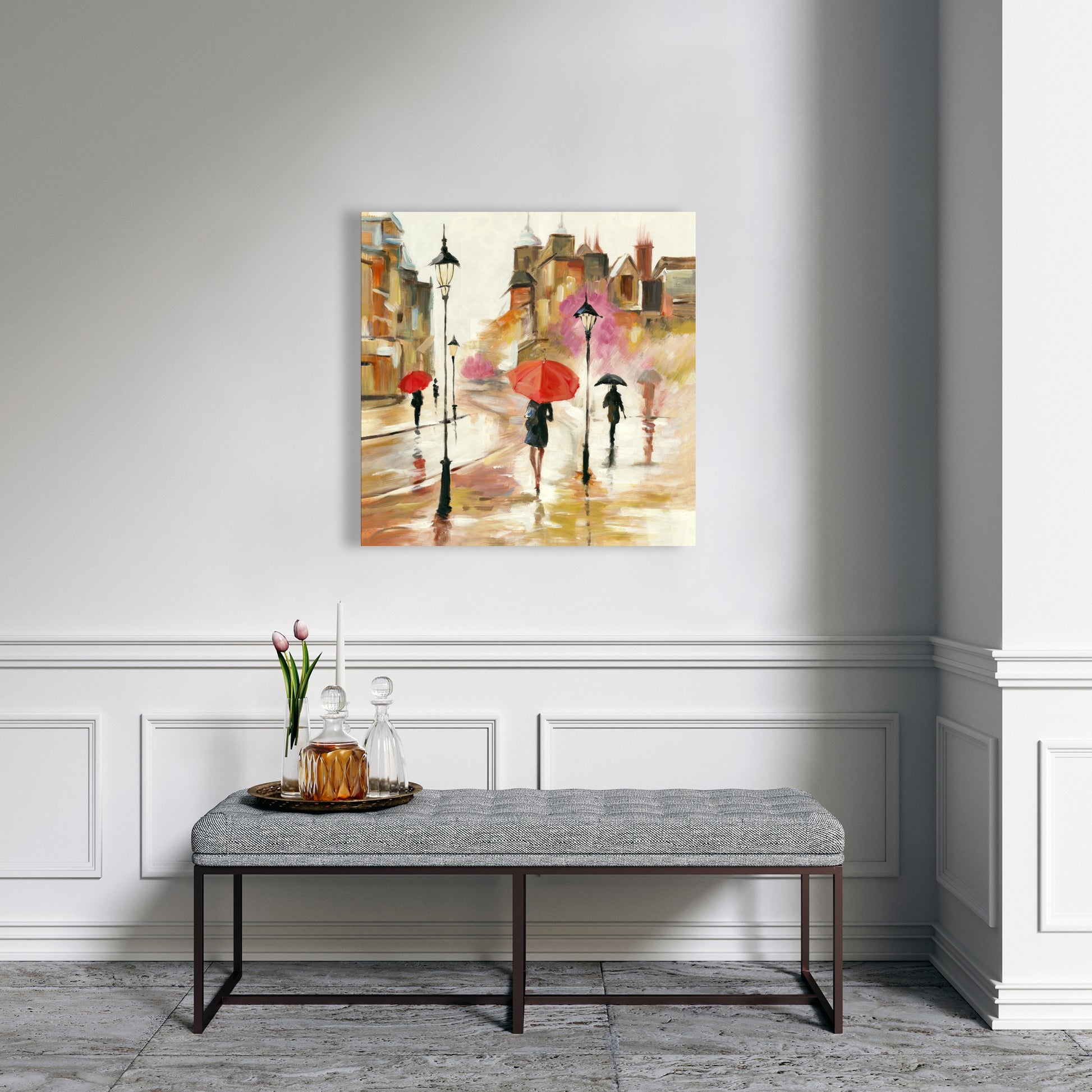 Red Contemporary Canvas - Passersby under Umbrellas Artwork