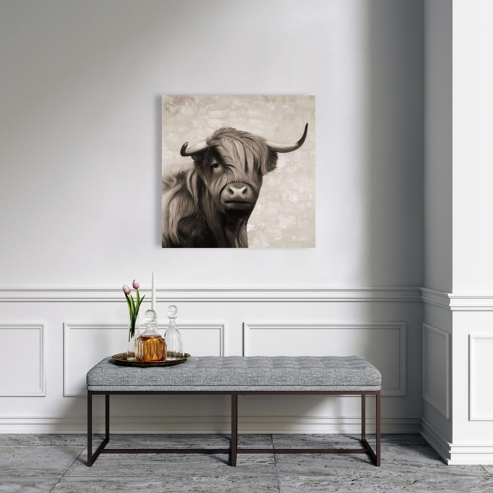 Transform your living space with the Highland Cattle Sepia Canvas - a stunning addition to any home decor. Featuring an enchanting sepia-toned image of majestic Highland cattle, this beige wall art piece brings a touch of rustic charm and warmth to your living room. Perfect for farmhouse-style interiors, the durable canvas ensures long-lasting quality while the neutral tones seamlessly blend with any color palette. Elevate your home’s aesthetic with this captivating artwork that captures the serene beauty and strong presence of these iconic animals. Easy to hang and maintain, this Highland Cattle Sepia Canvas is an ideal focal point for above the sofa or fireplace. Create a cozy ambiance and invite nature’s elegance into your home with this timeless piece. Perfect for animal lovers and those seeking a sophisticated yet rustic touch, this canvas is a versatile decor element. Order now and redefine your space with this exquisite homage to Highland cattle.