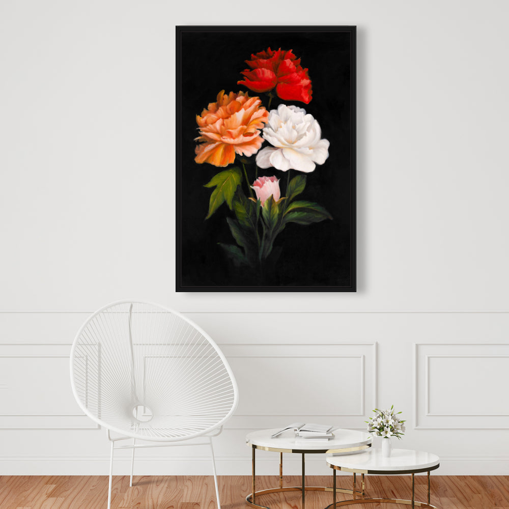 Three beautiful rose flowers - Transform your living room with this stunning black framed canvas featuring three exquisite rose flowers. Perfect for floral and botanical enthusiasts, this artwork adds a touch of elegance and sophistication to any space. The vibrant colors and intricate details of the roses create a captivating focal point, making it an ideal home decor piece for both modern and traditional interiors.