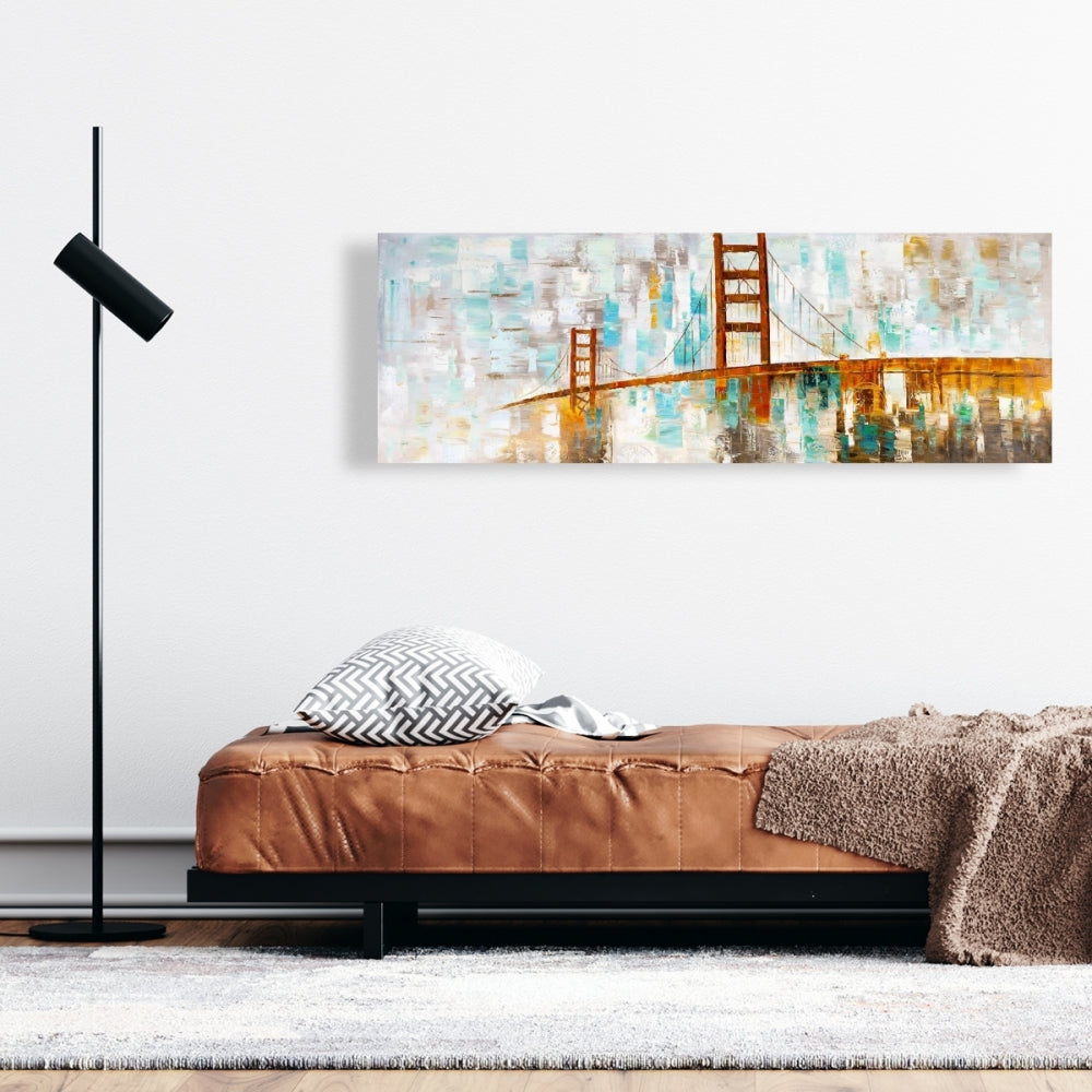 Elevate your home decor with the Bedroom Industrial Cities Canvas featuring a striking "Golden Gate with Turquoise Paint Spots" design. This captivating artwork combines the iconic architectural beauty of the Golden Gate Bridge with a modern and artistic twist. The vibrant turquoise paint spots add a splash of color and creativity, making it a perfect centerpiece for any bedroom space. Crafted with high-quality materials, this canvas ensures durability and a stunning visual impact. Ideal for urban and industrial-themed interiors, it brings a unique blend of classic and contemporary styles to your home. Enhance your space with this eye-catching piece that captures the essence of city life and artistic expression. Perfect for those who appreciate both the elegance of iconic landmarks and the charm of modern art. Transform your bedroom into a stylish sanctuary with the "Golden Gate with Turquoise Paint Spots" canvas, and let your walls tell a story of beauty and innovation.